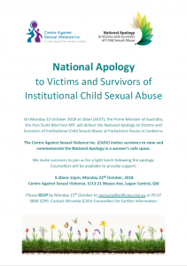 On Monday 22 October 2018 at 10am (AEST), the Prime Minister of Australia, the Hon Scott Morrison MP, will deliver the National Apology to Victims and Survivors of Institutional Child Sexual Abuse at Parliament House in Canberra. The Centre Against Sexual Violence Inc. (CASV) invites survivors to view and commemorate the National Apology in a women’s safe space. We invite survivors to join us for a light lunch following the apology. Counsellors will be available to provide support.